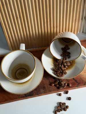 Les sous-tasses reprennent ce même langage esthétique : la céramique blanche s’enrichit d’un dégradé brun-doré, en parfaite harmonie avec l’intérieur des tasses. L’ensemble forme un duo cohérent et élégant.